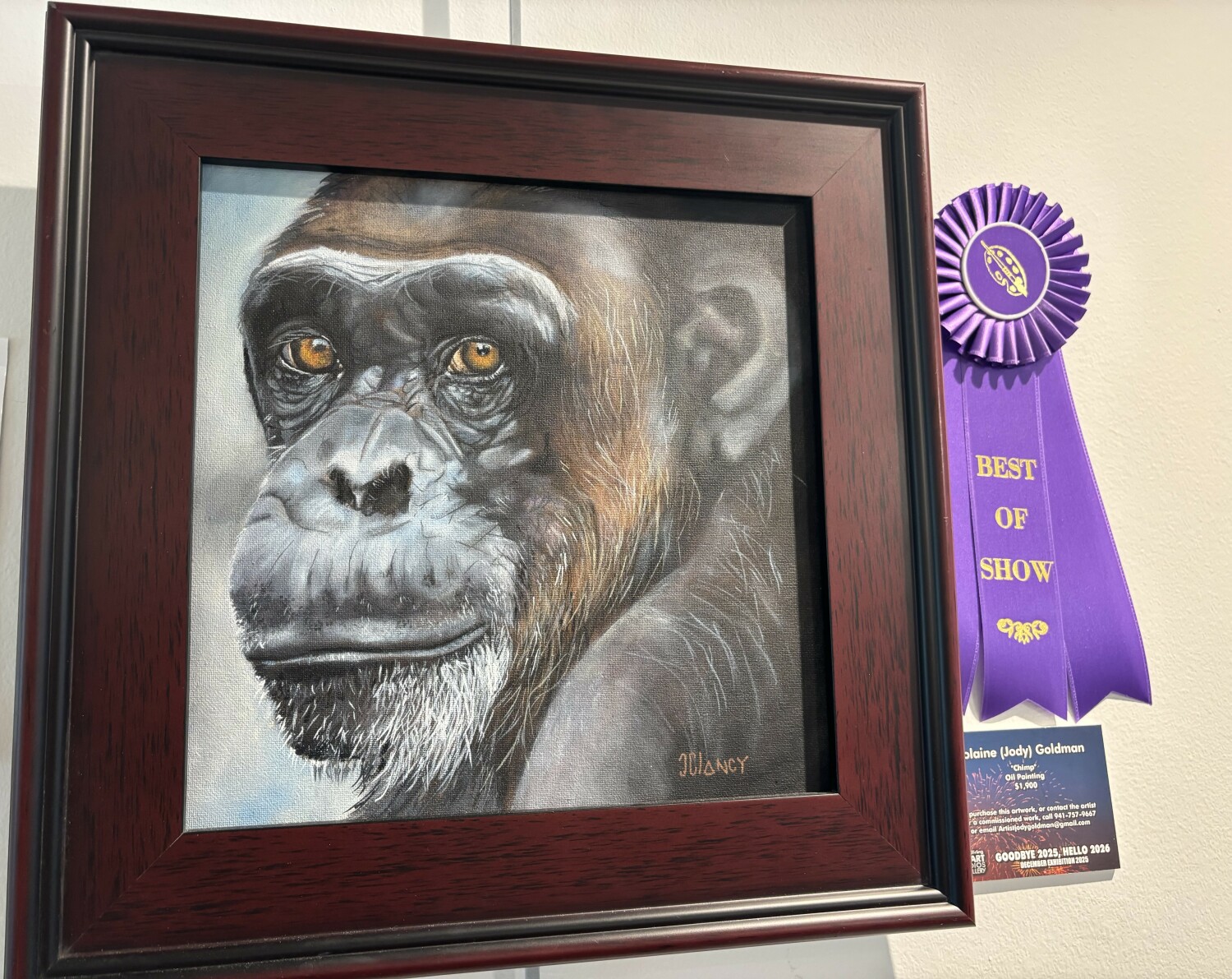 In the fall of 2022 I entered a global Fine Art Contest hosted by www.Art4Apes.com. The proceeds from this competition raised $10,000.00 and were used to fund the Center for Great Apes. This highly competitive exhibition featured over 500 artists from all around the world, and had a most prestigious panel or jurors: Bruce Helander (artist and entrepreneur), Ron Magill (Director of Miami-Dade Zoo), Frans de Waal (Dutch primatologist) and Philip Wollen (philanthropist and previous VP of Citibank).